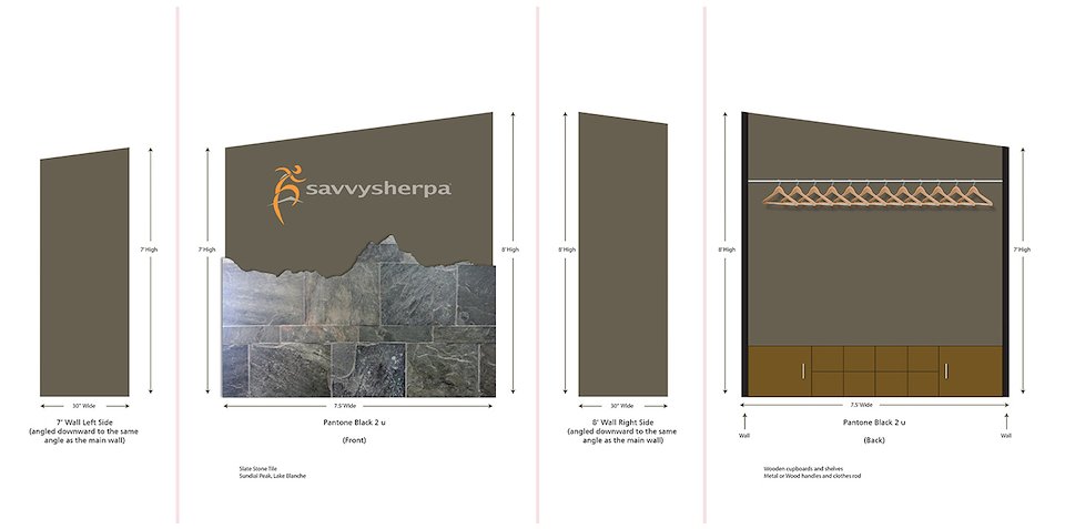 Designed an entry wall for the office in Draper, Utah. The front of the wall contains the logo which is three-dimensional, and carved from wood. The stone facade is slate stone tile, sculpted to reflect one of the mountain ranges along the Wasatch Front. The tile wraps around the 2 short sides. The backside is for coats and storage cupboards as depicted in this mock-up.