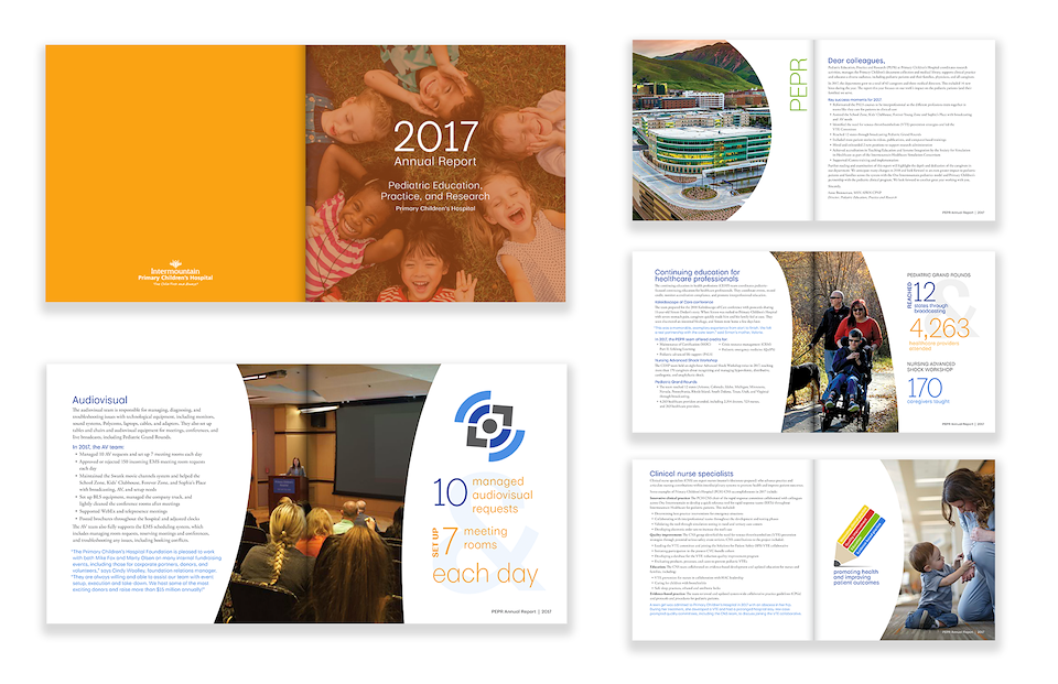 A sample of a 32-page (8"x8") Annual Report designed for the Pediatric Education, Practice and Research team at Primary Children's Hospital.