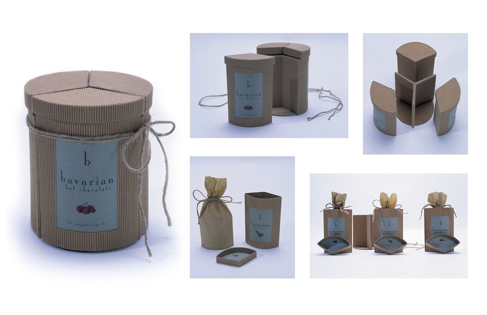 This is a package design I created, (from concept, materials used, labeling, and packaging) utilizing the inclusion of 3 different flavors of hot chocolate mix combined as one unit, but inheriting the ability to separate them when fully opened.