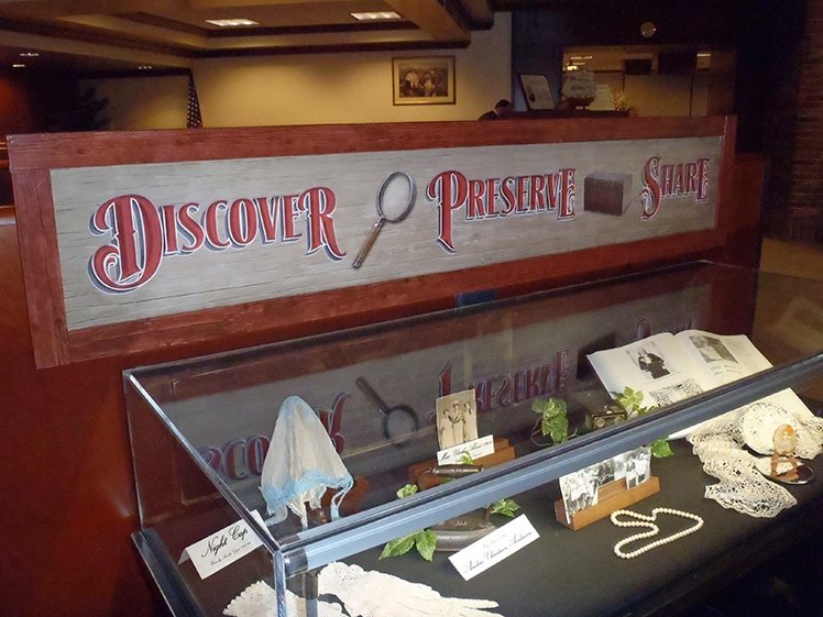 Designed this for the Family Search Center to resemble an antique wooden sign. I fabricated the sign by using foam-core board and various color prints. The over-all dimensions are 70" wide and 14" tall. This image is the actual sign installed in the designated area.